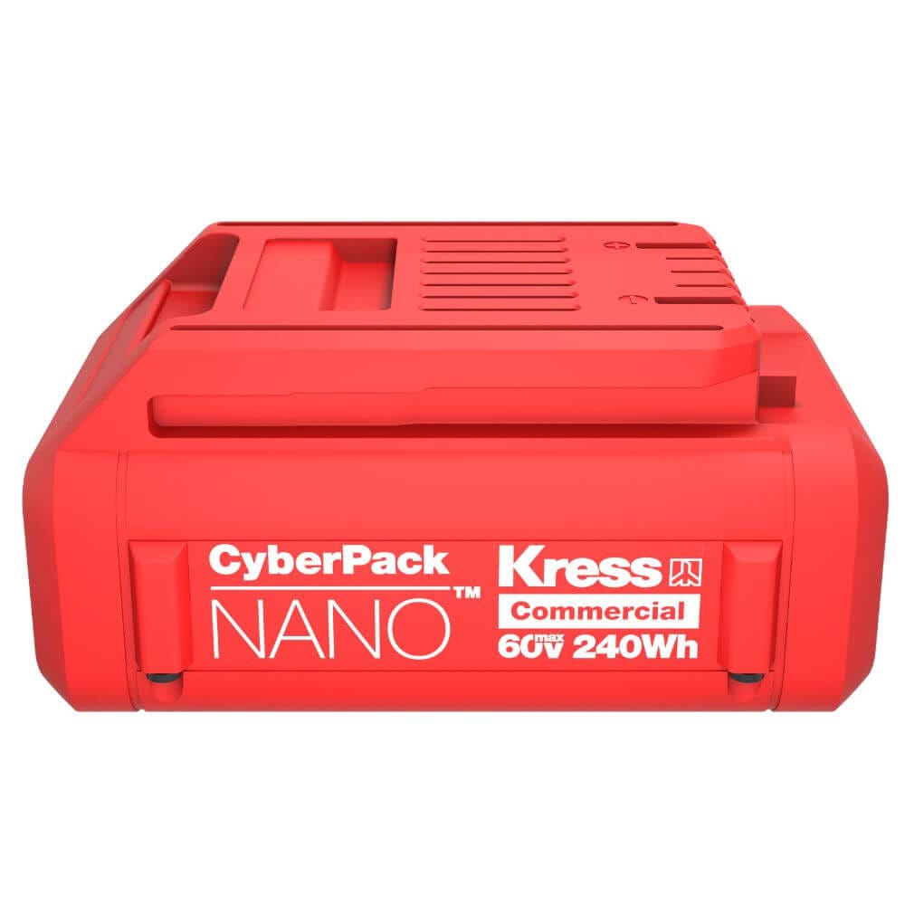 La CyberPack Nano 60 V è studiata per applicazioni commerciali dove leggerezza e compattezza sono cruciali, senza rinunciare alla potenza necessaria per alimentare utensili professionali come decespugliatori, tagliasiepi, motoseghe e robot rasaerba della linea Kress 60 V.